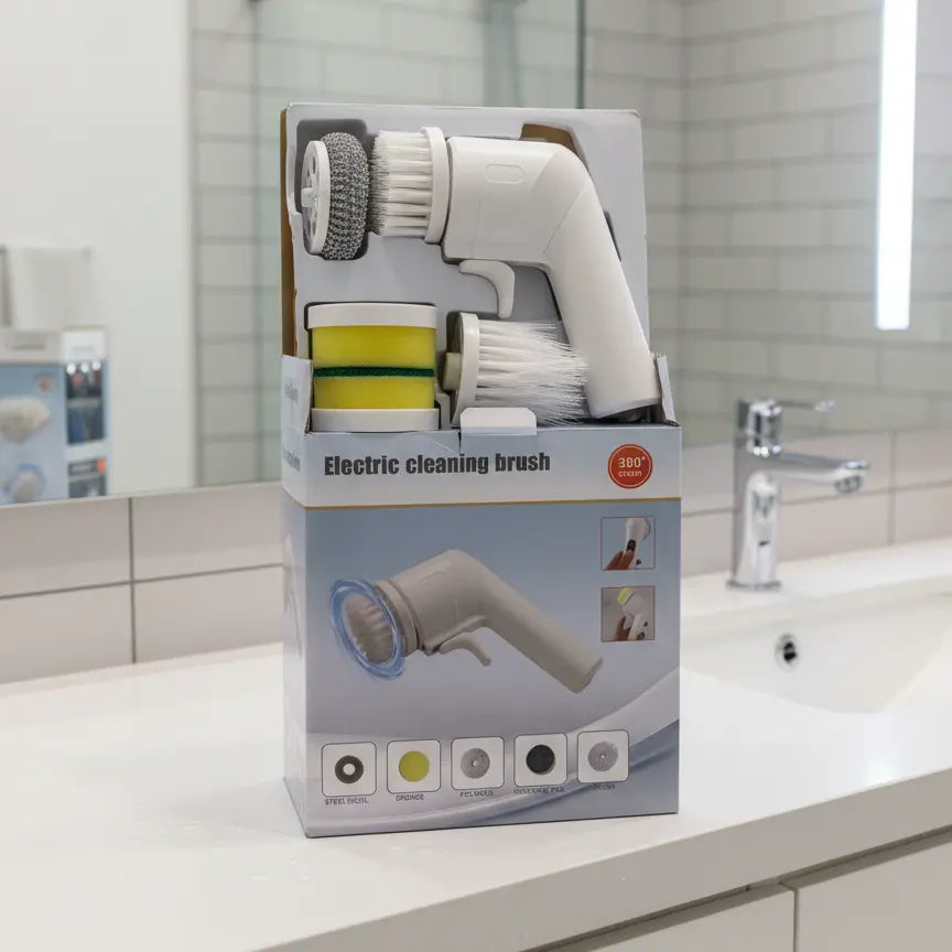 Electric Cleaning Brush with Multiple Attachments is a powerful 360° rotating scrubber designed for fast and easy home cleaning. It comes with different heads including sponge, brush, and steel wool to clean various surfaces effectively. Ideal for kitchen, bathroom, tiles, and hard-to-reach areas, it saves time and effort while giving a deep and shiny clean finish. Portable, easy to use, and perfect for everyday cleaning tasks.